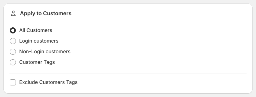 โ If you select All Customers/Login Customers, then you can choose Customers Tags for Exclude.