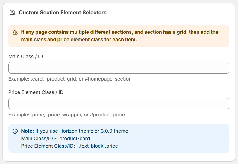 ๐ For Custom Section can use main class/id of that/each element and price element class/id.