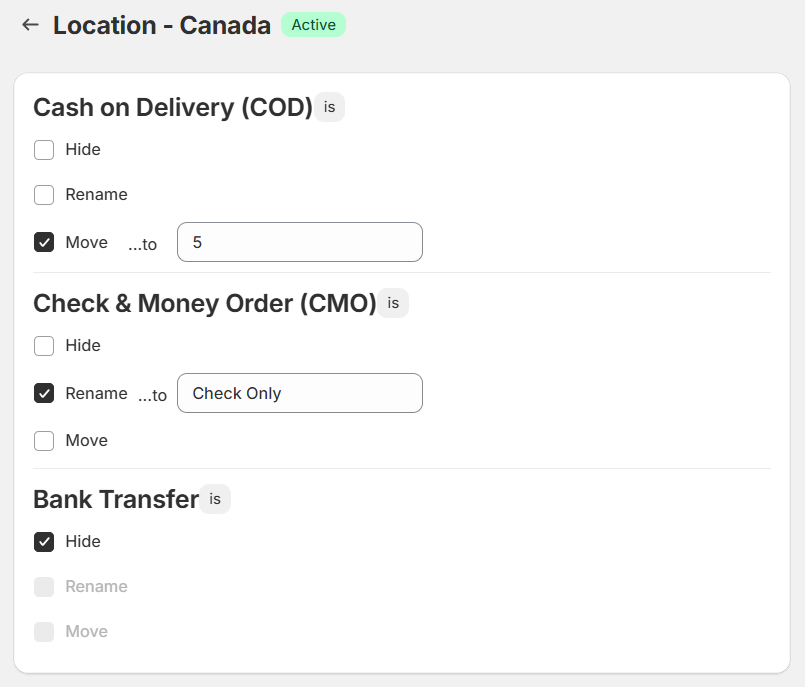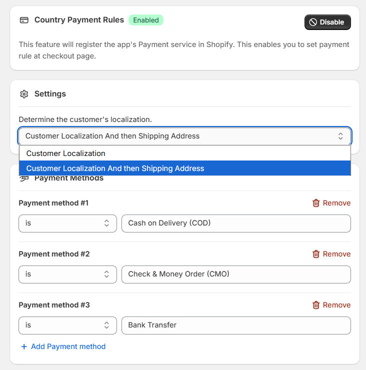 Use this setting for Country Payment Rules such as enable/disable, set customer's localization, and set multiple payment method.