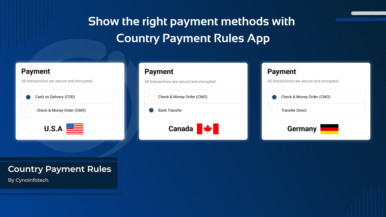 Country Payment Rules helps store owners provide customers with the most relevant and convenient payment options based on their location. Instead of showing all payment methods to every customer, you can easily configure which payment methods are available in specific country.