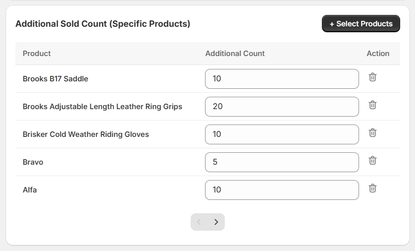 • You can add the additional number for All Products, it's shows on frontend real+additional sold count number.