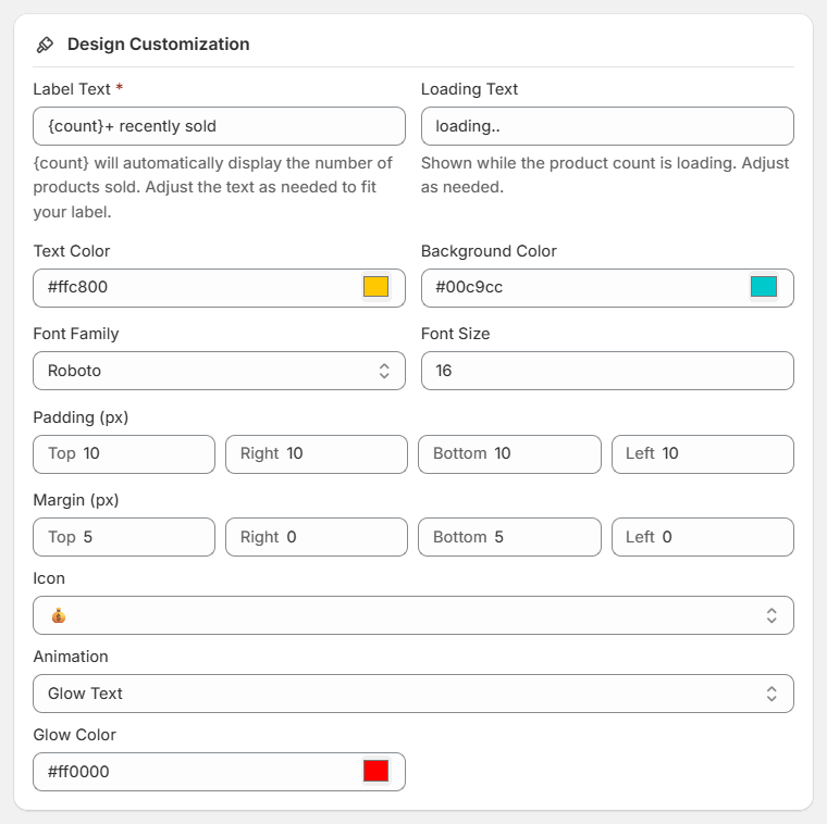 • Label Text: {count} is a variable so it's dynamic so don't change this for dynamic sold count product. You can add static text after this variable. If you don't want to go dynamic then you can add the static number for sold count product.