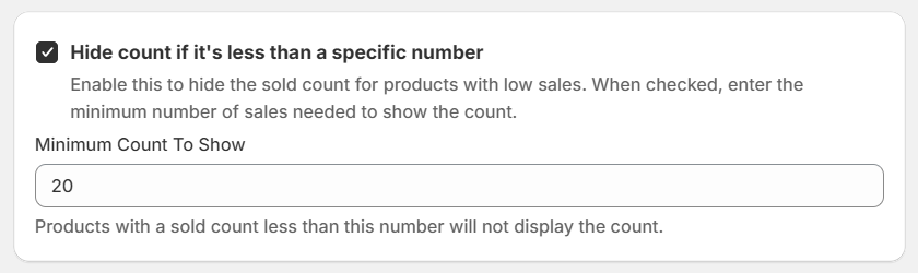 Use this setting for Sold Count Product such as Display on, Time rang for sold items, design customization, hide count for specific number and enable additional sold count.