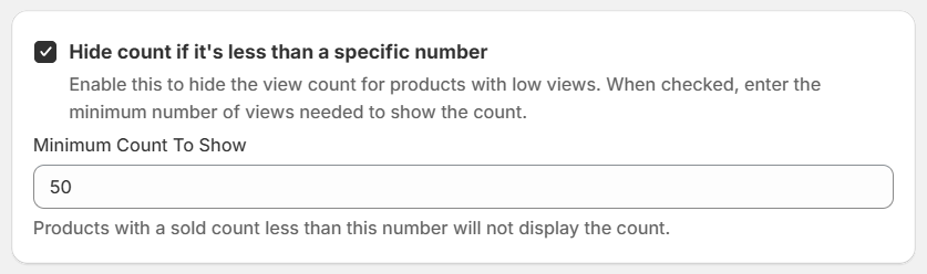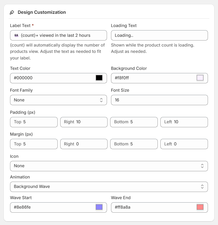 • Label Text: {count} is a variable so it's dynamic so don't change this for dynamic view count product. You can add static text after this variable. If you don't want to go dynamic then you can add the static number for view count product.